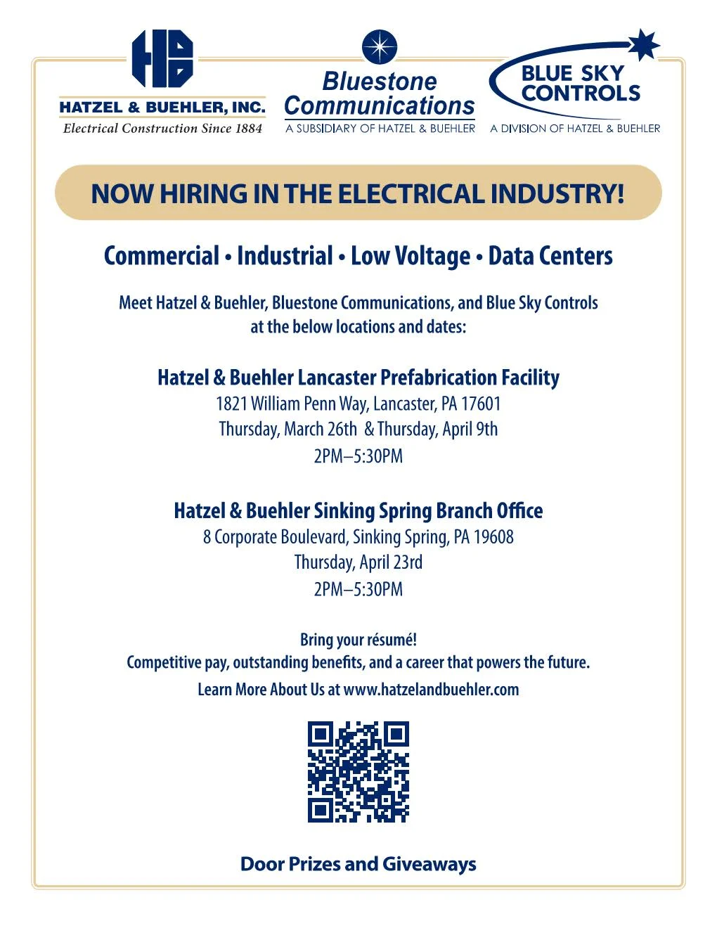 Now hiring in the electrical industry. Meet Hatzel & Buehler, Bluestone Communications, and Blue Sky Controls at the Lancaster Prefabrication Facility.