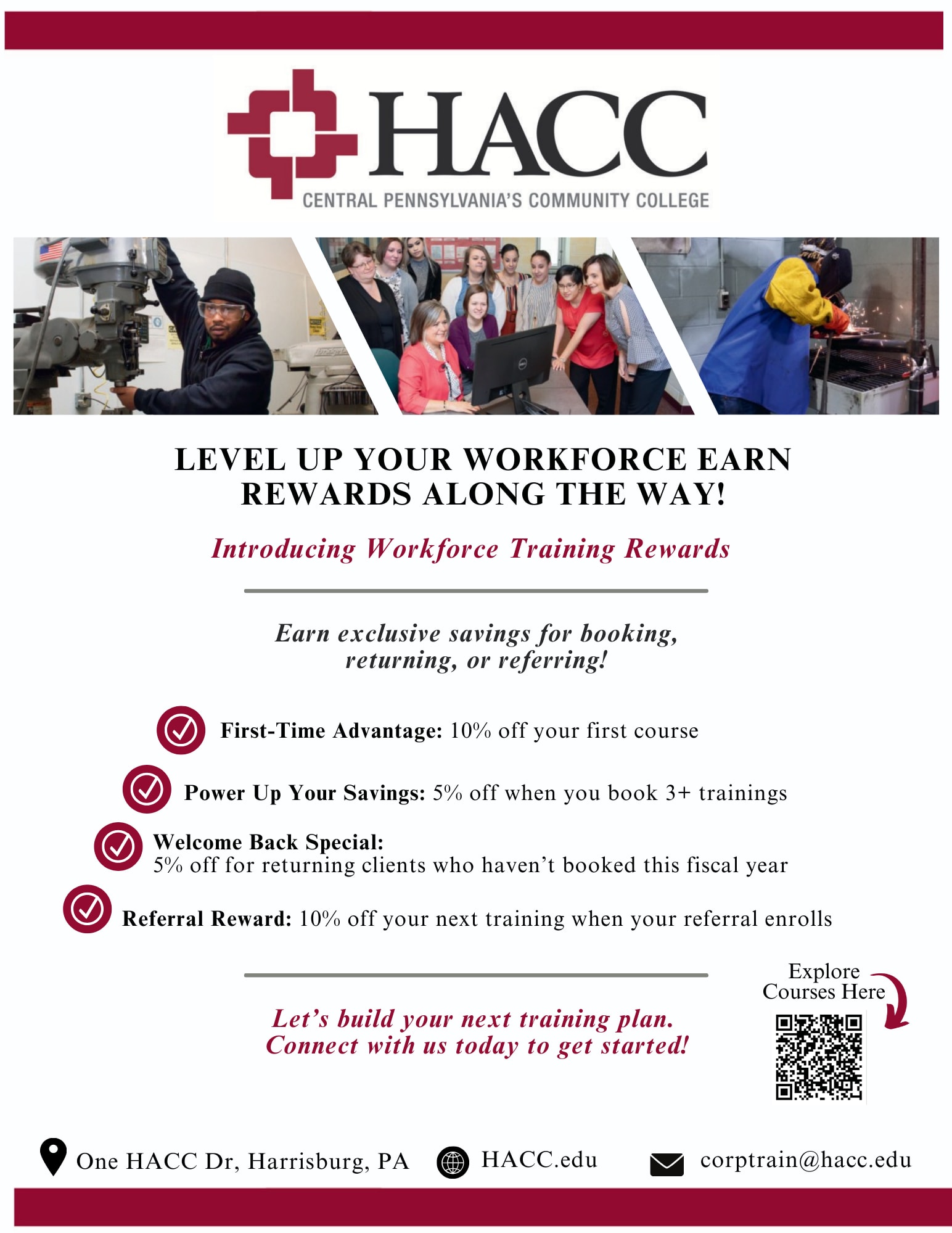 Our Workforce Training Rewards program helps employers grow a stronger, more skilled workforce while reducing training costs. Through this program, businesses can access high quality workforce training, earn financial incentives for participation, and build clear pathways for employee development and retention. It is a practical way to invest in your team, strengthen productivity, and stay competitive while being recognized for your commitment to workforce development in our community.