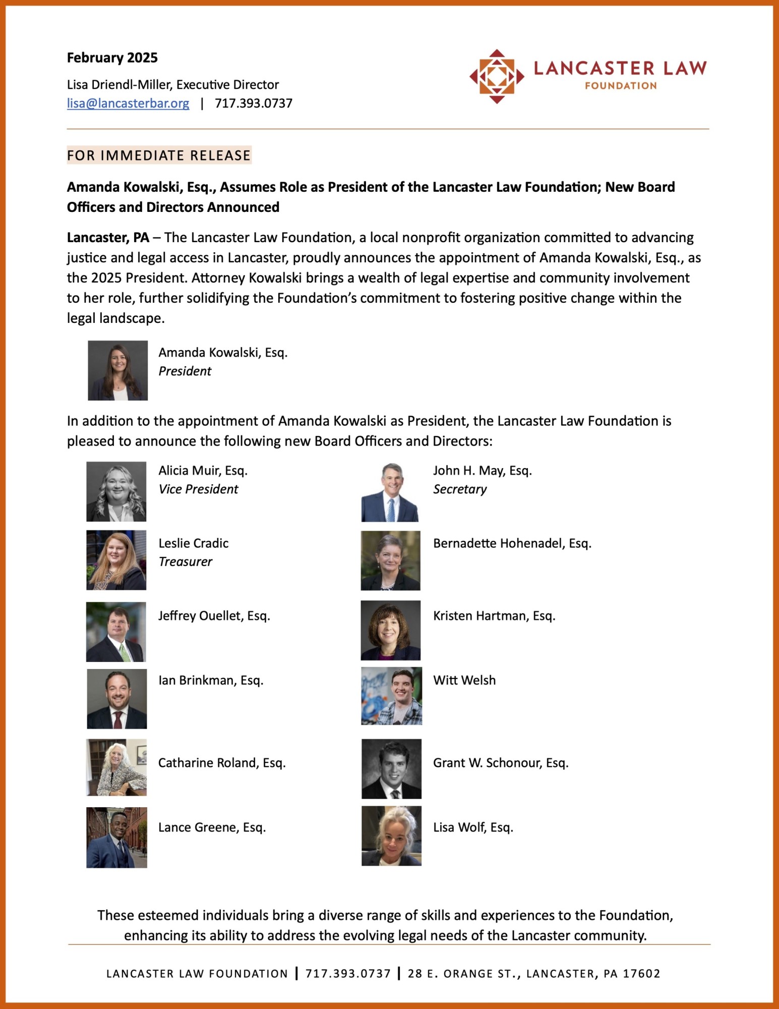 Amanda Kowalski, Esq., Assumes Role as President of the Lancaster Law Foundation; New Board Officers and Directors Announced